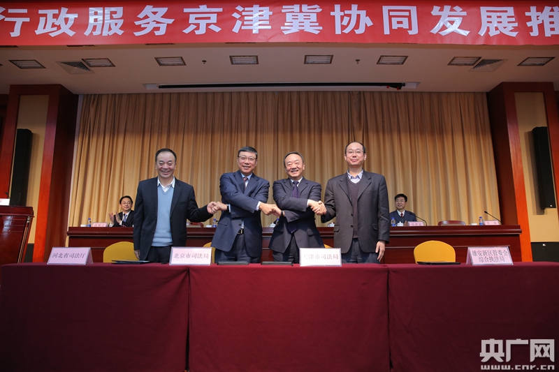 據(jù)悉,自2015年9月簽署《司法行政工作服務(wù)京津冀協(xié)同發(fā)展框架協(xié)議》,以及涉及法治宣傳、律師代理、公證、監(jiān)獄工作等4方面的“1+4”合作協(xié)議,正式拉開三地服務(wù)京津冀協(xié)同發(fā)展的序幕,開啟了三地共建共享、攜手并進(jìn)的新征程。2017年,三地又共同簽署《京津冀戒毒工作協(xié)同發(fā)展合作協(xié)議》,形成司法行政服務(wù)京津冀協(xié)同發(fā)展“1+9”的整體工作框架,實(shí)現(xiàn)對(duì)司法行政主要業(yè)務(wù)工作的全覆蓋,為最大限度地統(tǒng)籌三地司法行政資源,凝聚三地司法行政力量,全力服務(wù)京津冀協(xié)同發(fā)展奠定堅(jiān)實(shí)基礎(chǔ)。