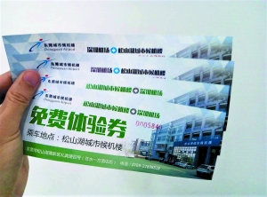 算上往返,你需要兩張免費體驗券——從莞去深的是綠色券,從深返莞的是藍色券。怎么領(lǐng)券?使用你的學生證,到松山湖城市候機樓就能免費領(lǐng)取。