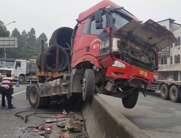重型半掛牽引車沖上了路面的水泥護(hù)欄,卡在那里動(dòng)彈不得。有多輛車被牽引車“騎”著,導(dǎo)致?lián)p毀嚴(yán)重。由于沖擊力很強(qiáng),有多輛車從車尾被撞擊,導(dǎo)致壓縮近半車身,車頭也被撞到慘不忍睹,連車輪都掉出來(lái)。事發(fā)導(dǎo)致路面出現(xiàn)擁堵,當(dāng)?shù)亟痪块T迅速趕往現(xiàn)場(chǎng)處理。