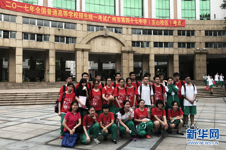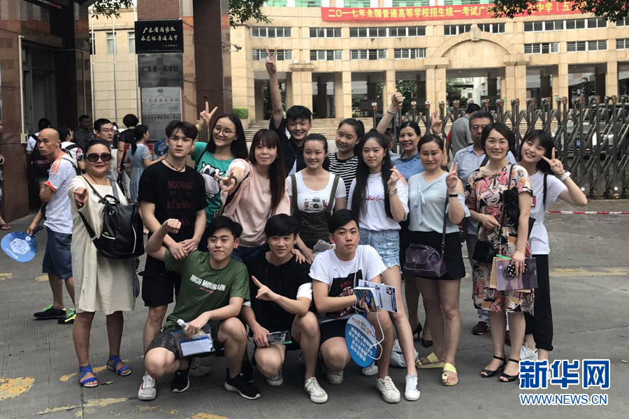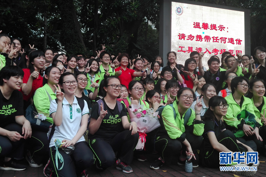 考生們在廣州市四十七中學考點合影留念,記錄下這珍貴的時刻。新華網(wǎng)發(fā)(李俊豪 攝)