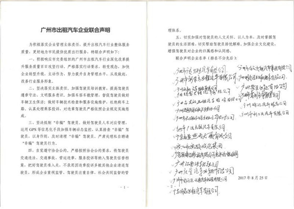 聯(lián)合聲明企業(yè)名單如下(排名不分先后):廣州市白云出租汽車集團(tuán)有限公司、廣州交通集團(tuán)出租汽車有限公司、廣州市廣駿旅汽集團(tuán)、廣州市天湖旅游出租汽車有限公司、廣州市廣發(fā)出租汽車有限公司、廣州市新東方出租汽車有限公司、廣州蜆富出租汽車有限公司、廣州市利士風(fēng)汽車有限公司、廣州市龍的出租汽車福分有限公司、廣州明通汽車出租服務(wù)有限公司、廣州慶星汽車出租有限公司、廣州市白云區(qū)云通汽車出租有限公司、廣州市廣達(dá)出租汽車有限公司、廣東國旅出租汽車有限公司、廣州聯(lián)星出租有限公司、廣東農(nóng)墾燕嶺大廈有限公司、廣州東方汽車有限公司、廣東省珠江航運有限公司汽車出租分公司、廣州珠江汽車服務(wù)公司、廣州麗新汽車服務(wù)有限公司、廣州江南汽車出租公司