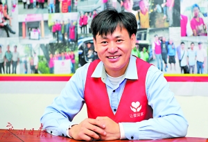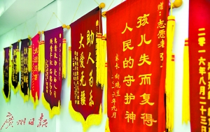 在東莞塘廈鎮(zhèn)的一處僻靜的小門店,是“讓愛回家”志愿者服務(wù)隊(duì)的臨時辦公室。這是去年5月,張世偉花950元租下的,墻壁上掛滿了多年來經(jīng)他幫助回家的流浪人員家屬送的錦旗。“我們最近幾年已經(jīng)不收錦旗了,太多了,根本沒地方放!比缃瘢尤胨麍F(tuán)隊(duì)的志愿者越來越多,達(dá)到3000名。