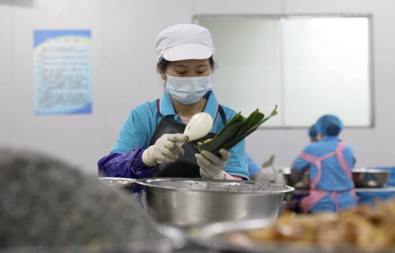工人們?cè)谲囬g里包粽子。龔普康攝