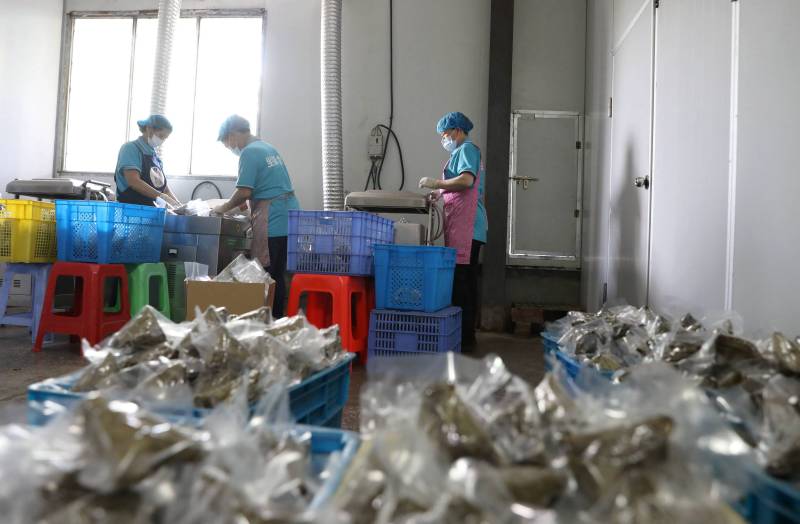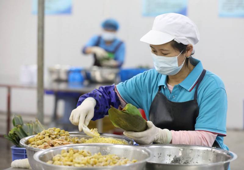 工人正在將粽子裝袋。龔普康攝