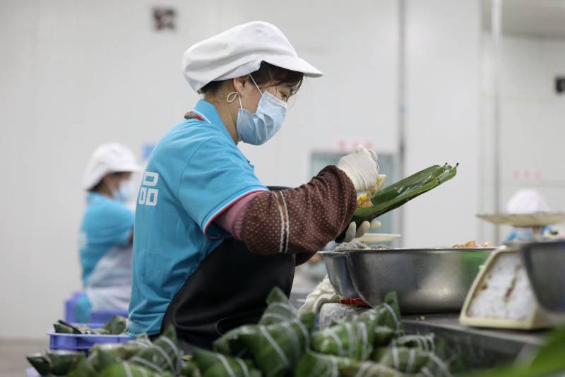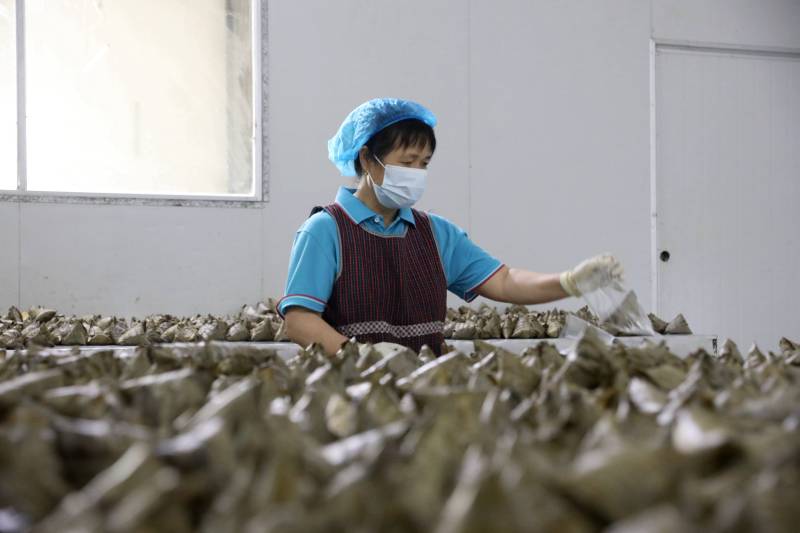 工人們正在車間里包粽子。龔普康攝