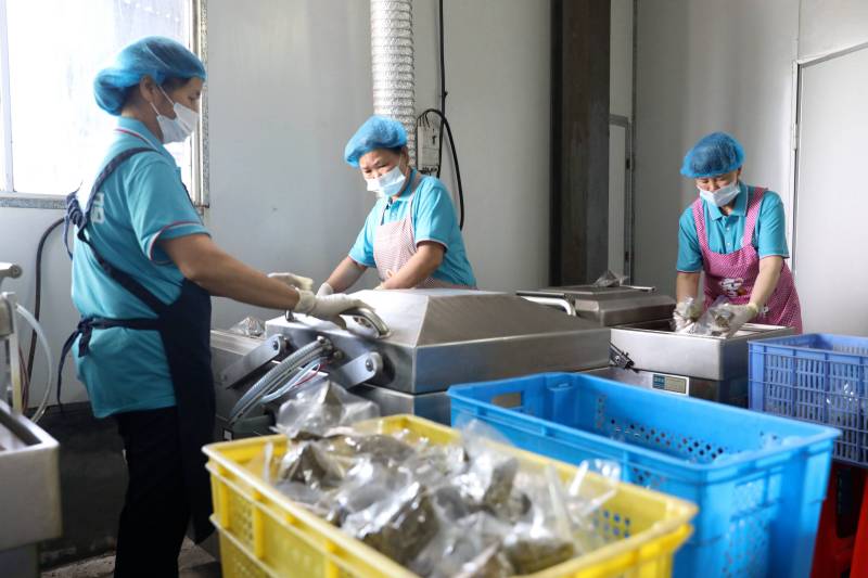 工人們?cè)谲囬g內(nèi)將粽子進(jìn)行真空包裝。龔普康攝