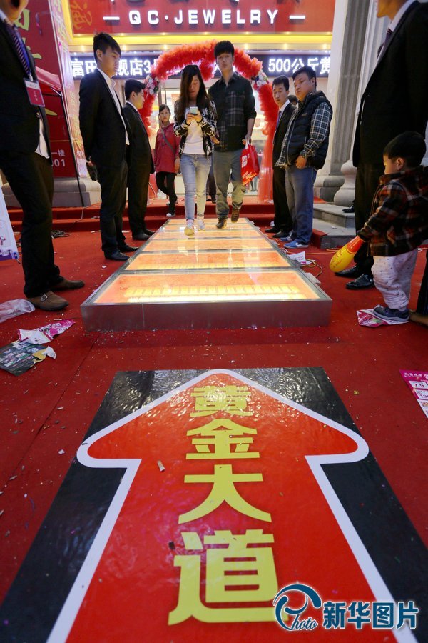 2014年3月30日,鄭州市民從用500公斤黃金鋪成的“黃金大道”上走過(guò)。
