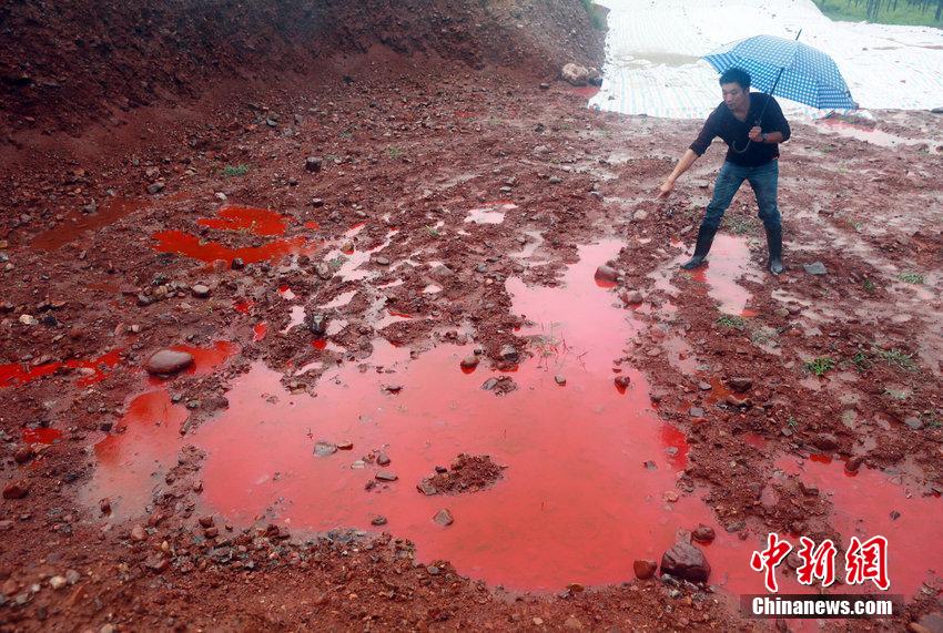 投產(chǎn)不久就出了問題!痹撃凶痈嬖V記者,去年12月份,廠子在生產(chǎn)過程中發(fā)生事故,造成罐體爆炸,整罐染料都流出來了,地下水都污染了,后來環(huán)保局就把廠子關(guān)了。山頂上都是廠子以前的殘留物,這次雨下得大都溢出來了,這才導(dǎo)致山下的馬蘭河里出現(xiàn)了“紅水”。