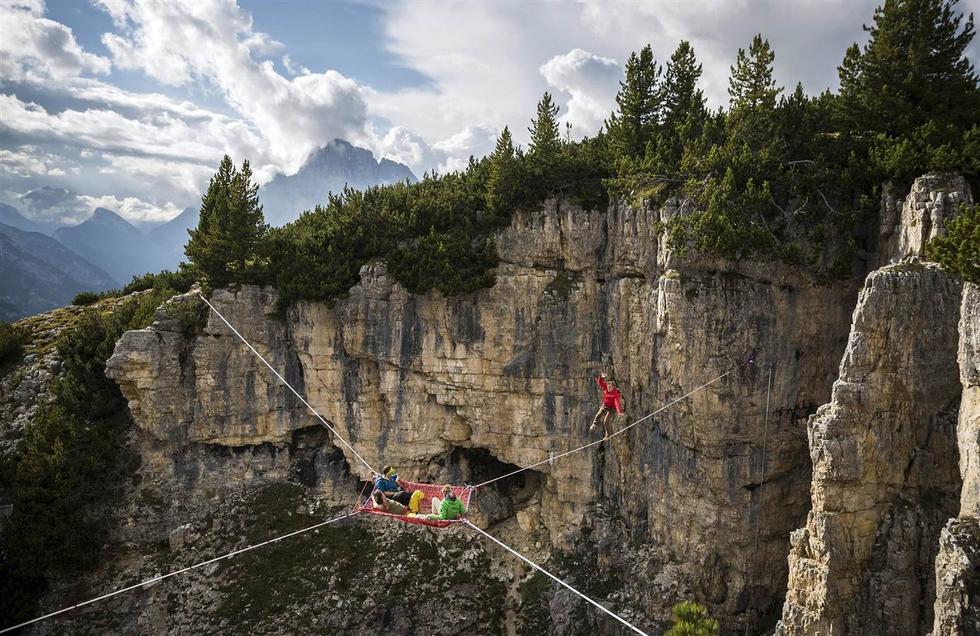 據(jù)NBC,意大利境內的阿爾卑斯山脈挺拔峻峭,擁有眾多隆起的山峰和巨石,是登山愛好者心中的理想勝地。2014年的國際高空繩索活動就在意大利北部的山谷中舉行,一組極限運動愛好者再次挑戰(zhàn)新創(chuàng)意,不僅將繩索架在山頭或巨石之間,還在繩索上面鋪起了吊床,一邊享受廣闊空間的蕩氣回腸,一邊俯瞰峽谷的驚心動魄,勇氣和心態(tài)著實令人佩服。