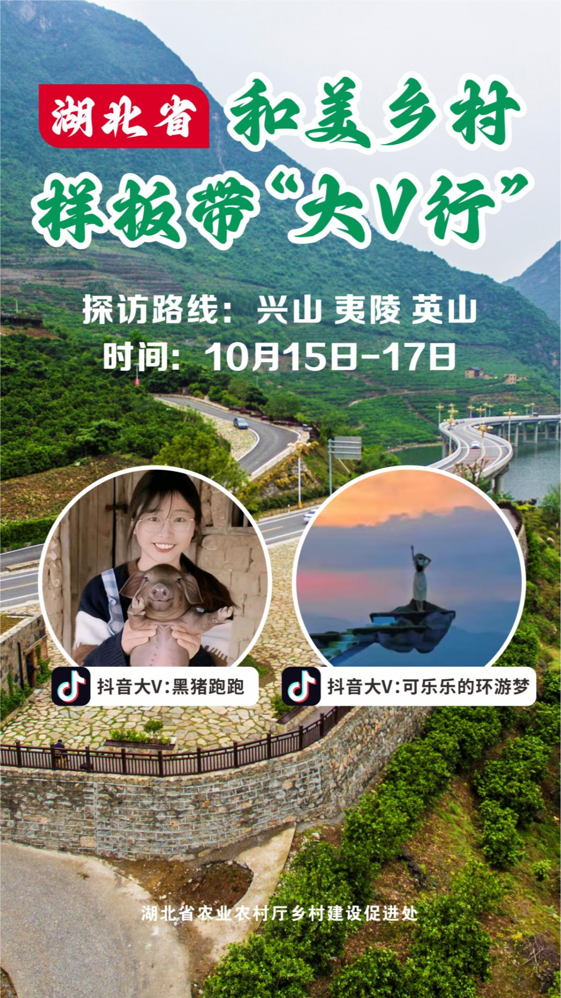 10月15日至17日,湖北省和美鄉(xiāng)村樣板帶“大V行”活動將再度啟程,抖音大V“可樂樂的環(huán)游夢”“黑豬跑跑”將帶你走進(jìn)宜昌市夷陵區(qū)、興山縣,以及黃岡市英山縣,看看這些地方如何把“生態(tài)綠”釀成“幸福甜”,把“好山水”變成“金招牌”。