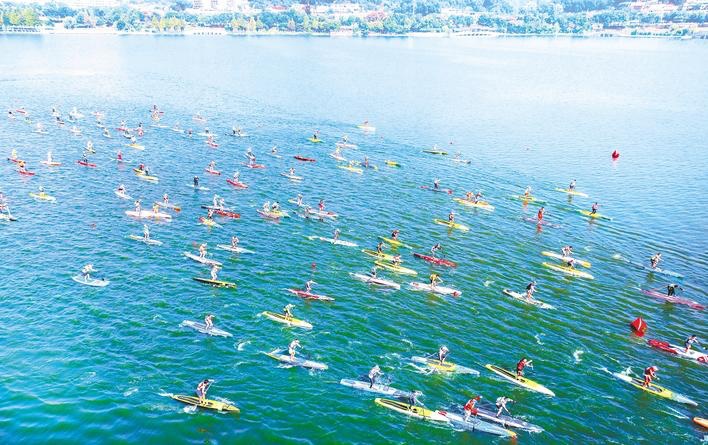 10月5日,2025黃石槳板邀請賽在磁湖未蘇灣開幕。來自國內外的500余名運動員齊聚黃石,揮槳競速、碧波爭鋒。