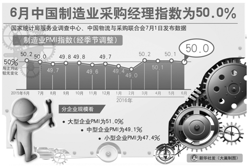 國家統(tǒng)計(jì)局服務(wù)業(yè)調(diào)查中心、中國物流與采購聯(lián)合會剛剛發(fā)布,6月份中國制造業(yè)采購經(jīng)理指數(shù)(PMI)為50.0%,比上月下降0.1個(gè)百分點(diǎn)。非制造業(yè)商務(wù)活動指數(shù)為53.7%,較上月回升0.6個(gè)百分點(diǎn)。專家分析,目前去庫存效果明顯,市場供需平衡性轉(zhuǎn)好,價(jià)格回升。