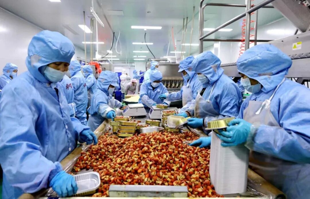 在位于彭澤縣的江西某食品有限公司的深加工車間,全自動生產(chǎn)線正忙碌地處理著小龍蝦。從清洗、蒸煮,到調(diào)味、包裝,一只只鮮活的小龍蝦,很快變成了一盒盒開袋加熱即食的蝦尾產(chǎn)品。