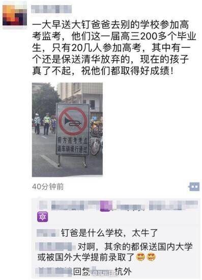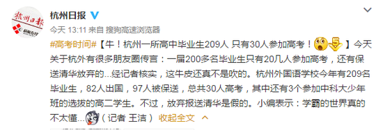 今天關(guān)于杭外有很多朋友圈傳言:一屆200多名畢業(yè)生只有20幾人參加高考,還有保送清華放棄的...經(jīng)記者核實,這牛皮還真不是吹的。杭州外國語學(xué)校今年有209名畢業(yè)生,82人出國,97人被保送,總共30人高考,其中還有3個參加中科大少年班的選拔的高二學(xué)生。不過,放棄報送清華是假的。小編表示:學(xué)霸的世界真的不太懂...