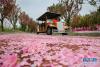 •   4月17日,一夜風(fēng)雨過后,江蘇南通洲際綠博園櫻花大道上櫻花花瓣飄落一地。 新華社發(fā)(許叢軍 攝)
