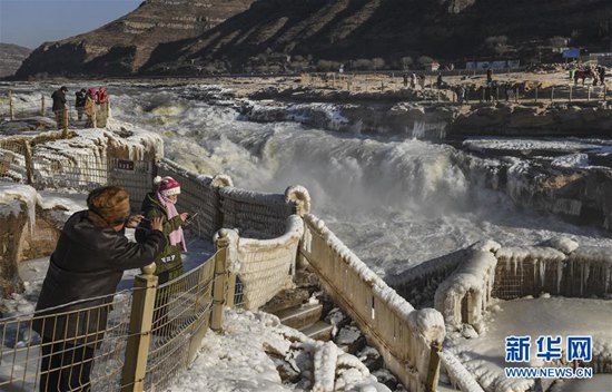 12月11日,吉縣黃河壺口瀑布出現(xiàn)“冰瀑玉壺”景觀。近日,受持續(xù)降溫天氣影響,吉縣黃河壺口瀑布出現(xiàn)“冰瀑玉壺”景觀,瀑布下游的十里龍槽已完全被流凌覆蓋,凝結成潔白的“玉帶”,吸引了眾多游客和攝影愛好者前來感受冬日里的別樣景觀。