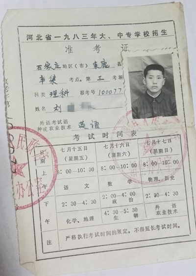 1983年劉靜心(化名)參加高考時所用的準考證,他一直珍藏到現(xiàn)在。