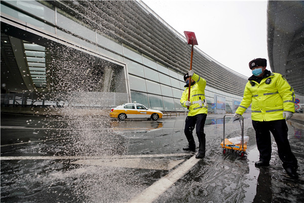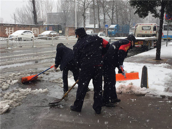 北京南站交警隊安排專人值守站區(qū)高架橋梁、急彎等危險路段,及時對結冰路段拋灑融雪鹽,對路面積雪進行不間斷清除,確保進站道路正常通行。