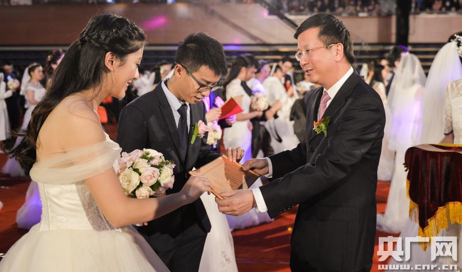 浙大黨委書記鄒曉東為新人們頒發(fā)集體婚禮紀念證書 -