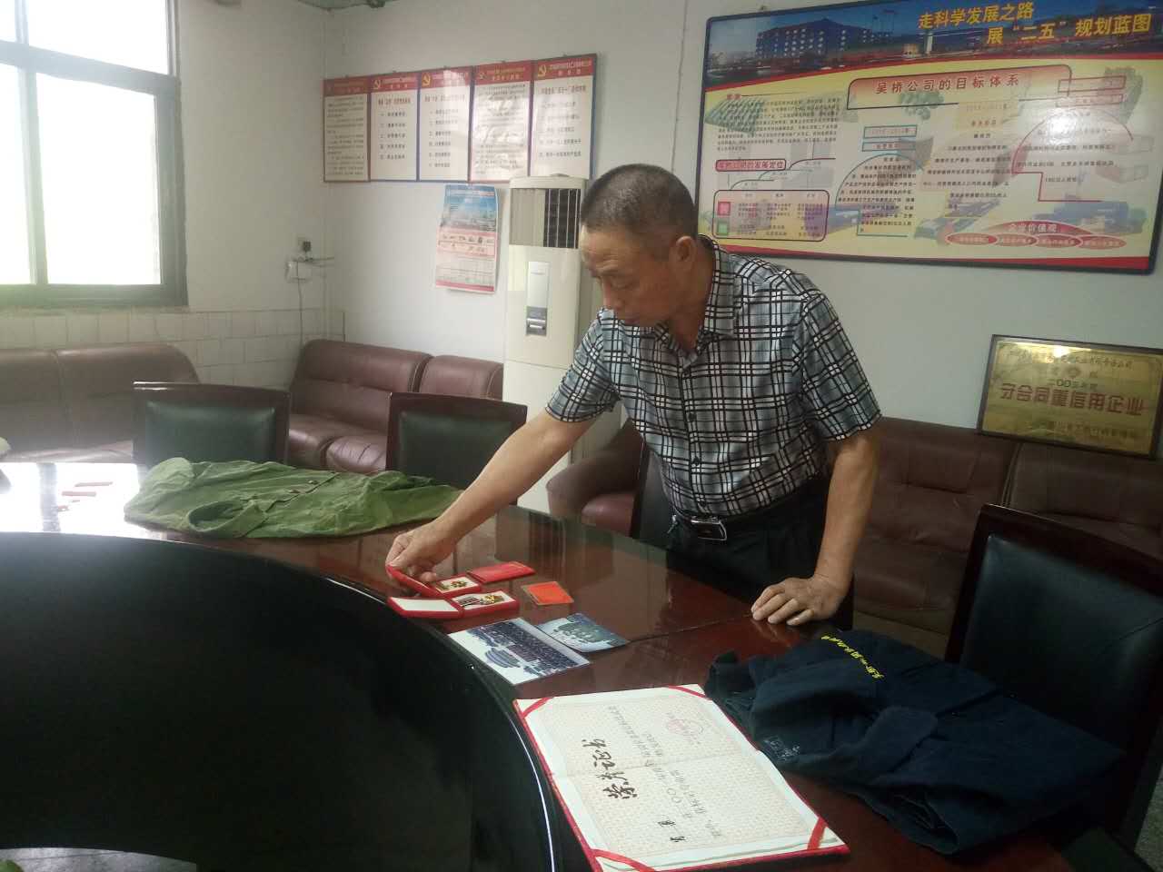 該退伍士兵榮譽(yù)室位于吳橋建材公司廠區(qū)辦公樓內(nèi),李德高倡導(dǎo)辦退伍士兵榮譽(yù)室的想法得到了當(dāng)?shù)仉p擁辦、村組以及軍民共建先進(jìn)單位的支持,更得到了20余名退役士兵的積極響應(yīng)。大家紛紛把自己從軍路上具有紀(jì)念意義的舊軍裝、優(yōu)秀士兵勛章、退役士兵證書、軍用水壺等軍用品以及轉(zhuǎn)業(yè)、退伍到地方曾經(jīng)工作過的勞保手套、獎(jiǎng)狀、照片等交到了老人的手里。