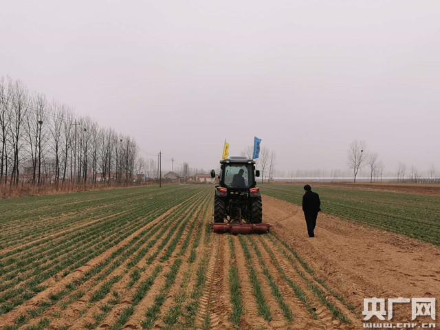 農(nóng)戶為麥苗進(jìn)行機(jī)械鎮(zhèn)壓(央廣網(wǎng)發(fā) 臧富貴 攝)