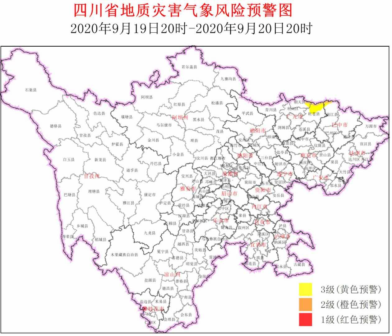 央廣網成都9月19日消息(記者劉濤)結合四川省氣象臺天氣預報情況,四川省地質災害指揮部辦公室發(fā)布9月19日20時~9月20日20時,全省地質災害氣象風險3級黃色預警。