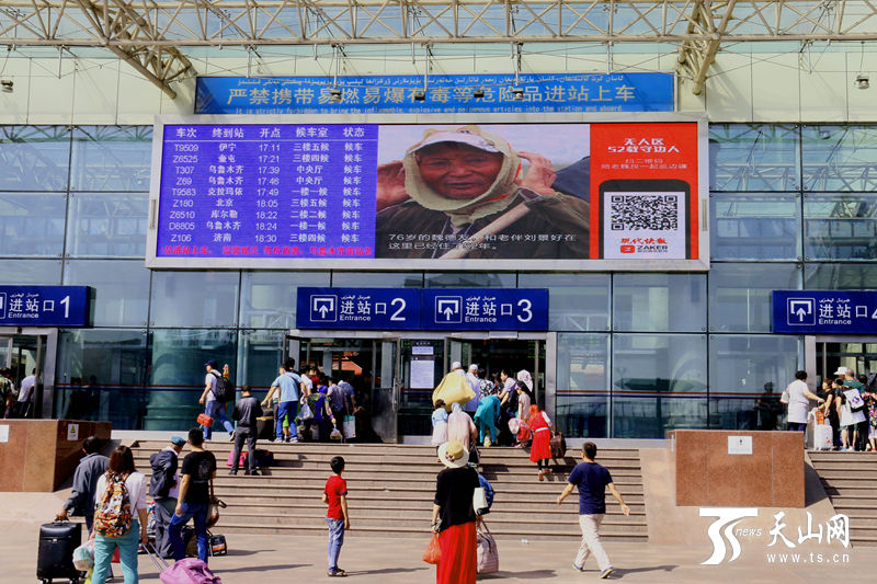 8月3日,烏魯木齊市火車(chē)南站站前廣場(chǎng),大屏幕上正播放著《無(wú)人區(qū)·52載守邊人》公益短片。