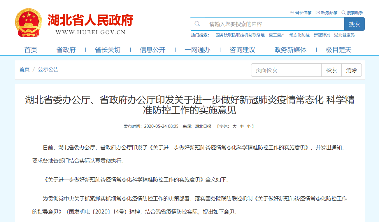 日前,湖北省委辦公廳、省政府辦公廳印發(fā)了《關(guān)于進一步做好新冠肺炎疫情常態(tài)化科學精準防控工作的實施意見》,并發(fā)出通知,要求各地各部門結(jié)合實際認真貫徹執(zhí)行。