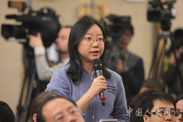 3月11日上午,十二屆全國人大二次會議在梅地亞中心舉行記者會,中國人民銀行行長周小川等五位嘉賓就“金融改革與發(fā)展”的相關(guān)問題回答中外記者的提問。圖為中國日報、中國日報網(wǎng)記者提問。羅榮 攝