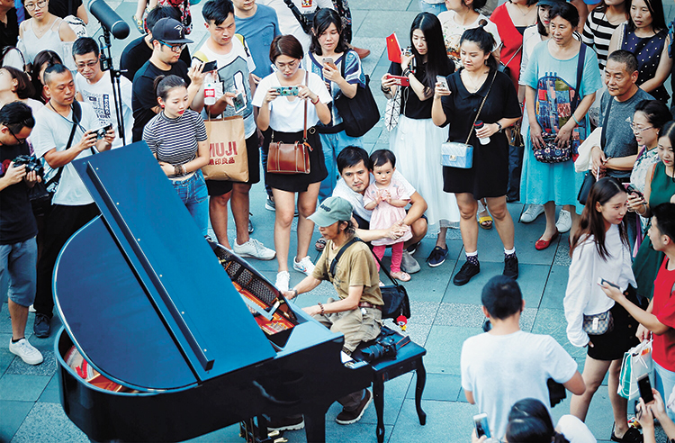 市民、游客或駐足欣賞,或用手中的相機(jī)、手機(jī)記錄這個(gè)驚喜時(shí)刻,后來索性加入全場(chǎng)大合唱