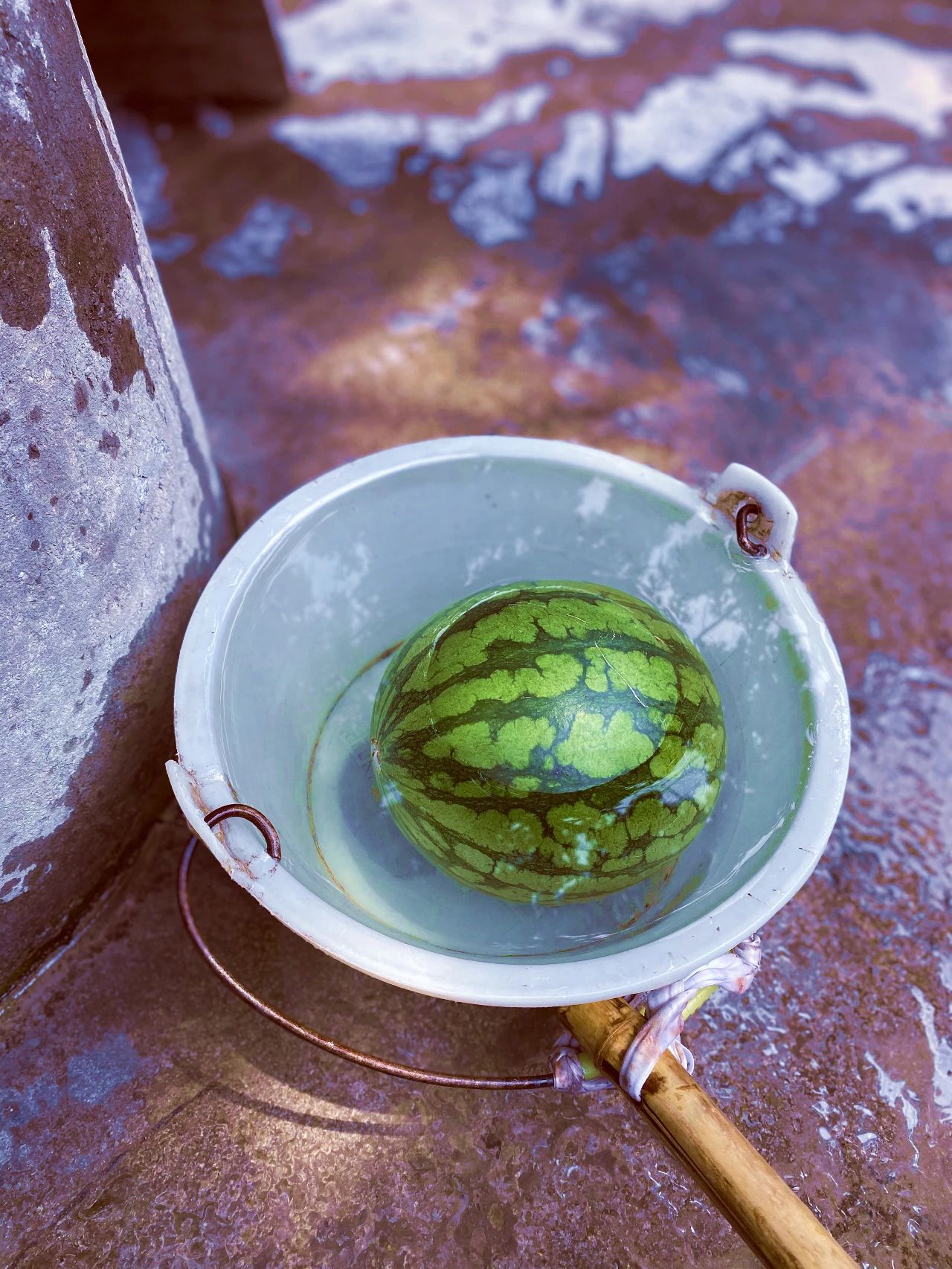 將西瓜放在網(wǎng)兜里,吊在井里半天。