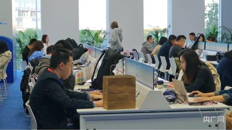 記者們?cè)谶M(jìn)博會(huì)新聞中心忙碌(央廣網(wǎng)記者 林馥榆 攝)