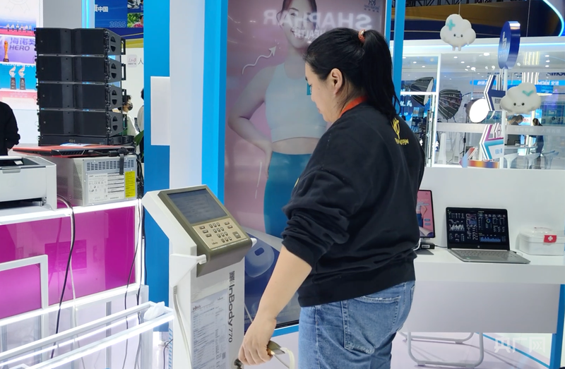 央廣網(wǎng)記者正在體驗(yàn)今年進(jìn)博會(huì)展示的首個(gè)科學(xué)減重體驗(yàn)空間(央廣網(wǎng)發(fā) 郭子萌 攝)