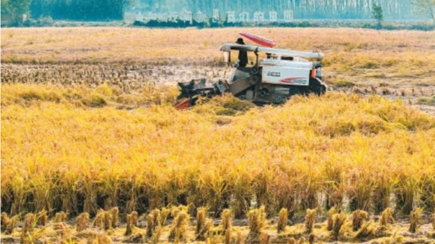 金秋時(shí)節(jié),長(zhǎng)安區(qū)十里蛤蟆灘稻浪翻金,收割機(jī)在田間穿梭,裹挾著稻香的風(fēng)里,連片“桂花球”水稻正迎來(lái)?yè)屖铡?/em>