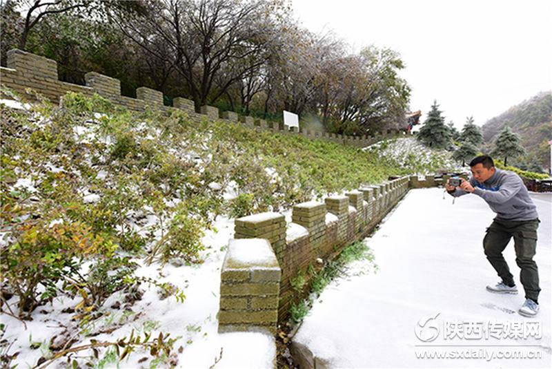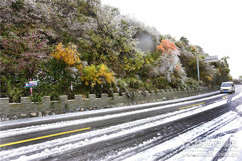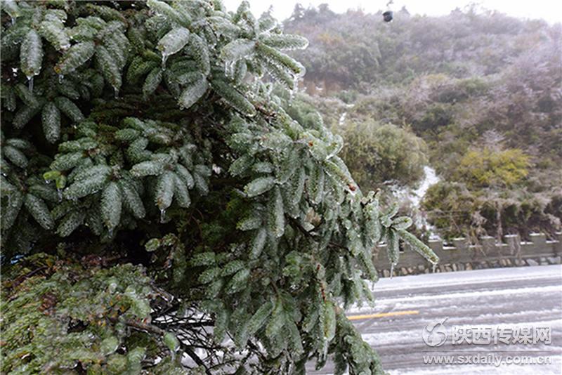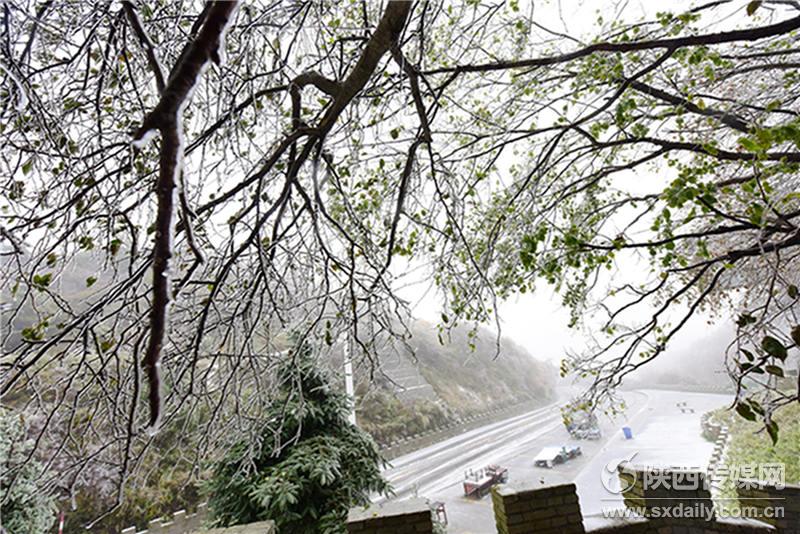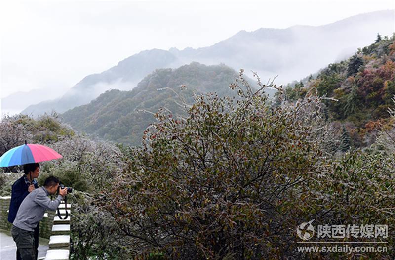 10月10日,在位于西安市長安區(qū)210國道秦嶺分水嶺,急劇的降溫、持續(xù)的秋雨,不但降下一場(chǎng)雪,還使這里的樹木上出現(xiàn)晶瑩剔透的冰掛景觀,很多市民紛紛趕來,目睹這一難得自然勝景。陜西日?qǐng)?bào)記者 袁景智攝