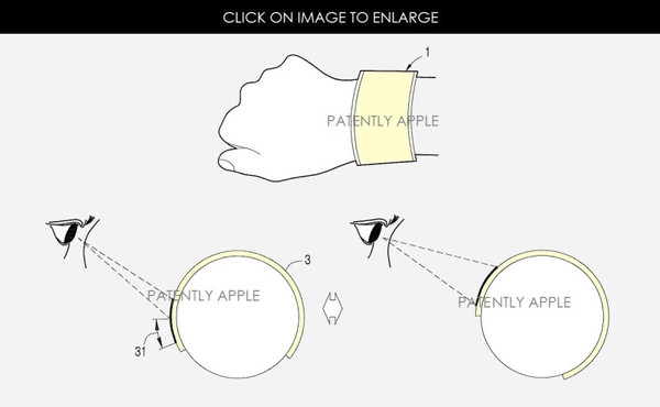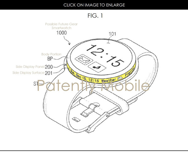 從專利圖中可以看出,這種智能手表的表盤外有一圈環(huán)形彎曲屏幕,可以顯示時間、天氣以及當(dāng)前播放的音樂等。據(jù)稱環(huán)形彎曲屏幕將被未來的Gear智能手表采用。