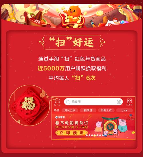 今年,支付寶首次聯(lián)動(dòng)淘寶每天派送100萬張福卡。消費(fèi)者打開手機(jī)淘寶,點(diǎn)擊首頁左上角“掃一掃”或者搜索框“拍立淘”,對(duì)準(zhǔn)紅色的年貨商品,識(shí)別后即可以有機(jī)會(huì)獲得支付寶?ɑ蛘呓鹭i等實(shí)物獎(jiǎng)勵(lì)。淘寶數(shù)據(jù)顯示,近5000萬用戶踴躍換取淘寶派送的新春福利,平均每人“掃”6次紅色年貨。