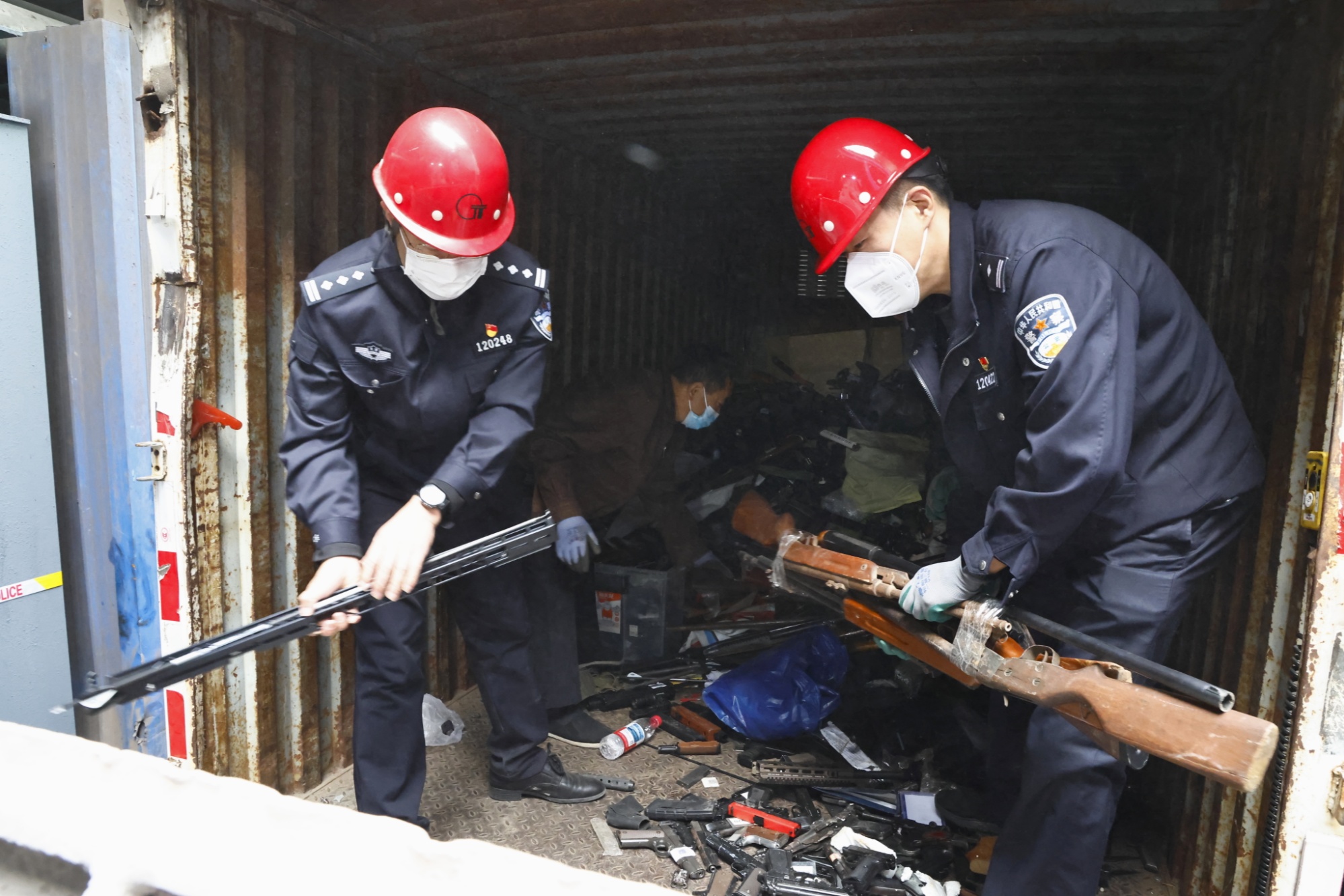 日前,天津市公安局對清查收繳的143支非法槍支和640件仿真槍、弩、管制刀具,進(jìn)行集中銷毀。