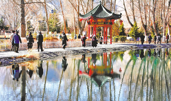 拉薩市民和游客在公園里散步。
