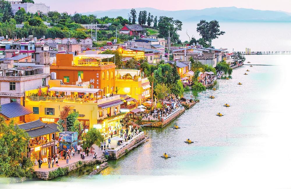 而在滇池之濱的海晏村,又是另一番景象。憑借落日景觀,這里人流如織,餐飲店與咖啡館燈火通明、座無虛席,“落日經(jīng)濟”效益顯著。