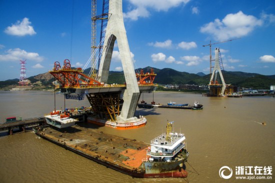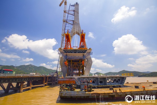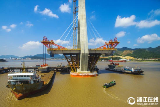 8月5日下午,寧波舟山港主通道富翅門(mén)大橋A標(biāo)架梁現(xiàn)場(chǎng),中交二航局兩臺(tái)起吊功率450噸架橋機(jī)把2片各重310噸的鋼混結(jié)合梁穩(wěn)穩(wěn)地吊裝至富翅門(mén)大橋A標(biāo)主橋橋面。目前,富翅門(mén)A標(biāo)已完成11片鋼混結(jié)合梁吊裝。
