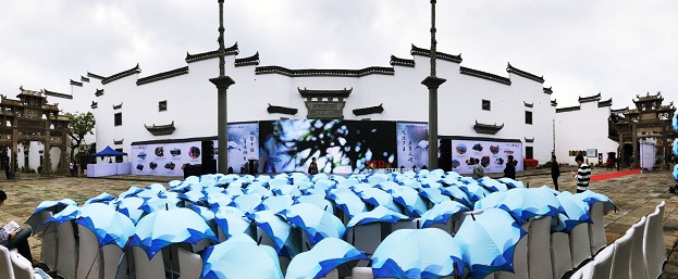 2017浙江旅游風情小鎮(zhèn)推廣季啟動儀式現(xiàn)場,不少嘉賓注意到了座位邊放著的一款以藍白色為主調的雨傘,打開它就會發(fā)現(xiàn),傘形的設計是四面八角涼亭,與江南小鎮(zhèn)的亭臺樓閣很合拍,傘面上主要畫有西湖山水,體現(xiàn)了“仁者見山,智者見水”的意境。